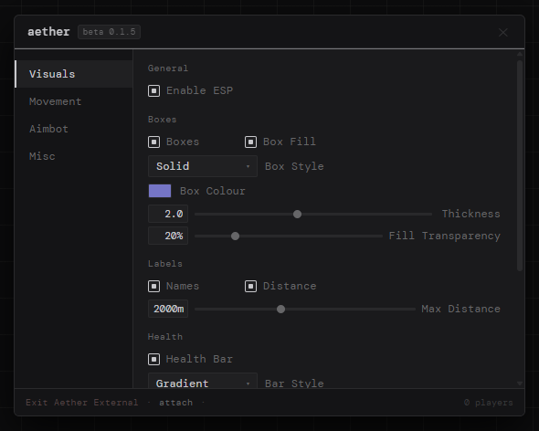 Aether External is a lightweight Roblox external focused on stability and clean functionality.